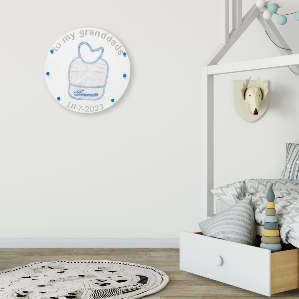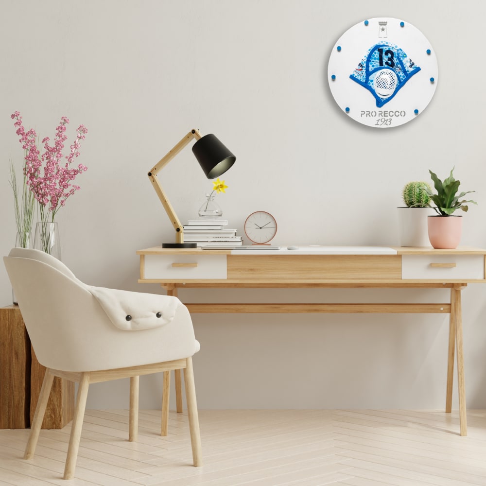 Cornice rotonda diametro 38 cm con base in metallo nel colore a scelta e copertura in vetro sintetico, fissato con sistema brevettato T-memo composto da magneti e copri magneti in acciaio standard o nel colore della cornice, senza incisione o con personalizzazione.